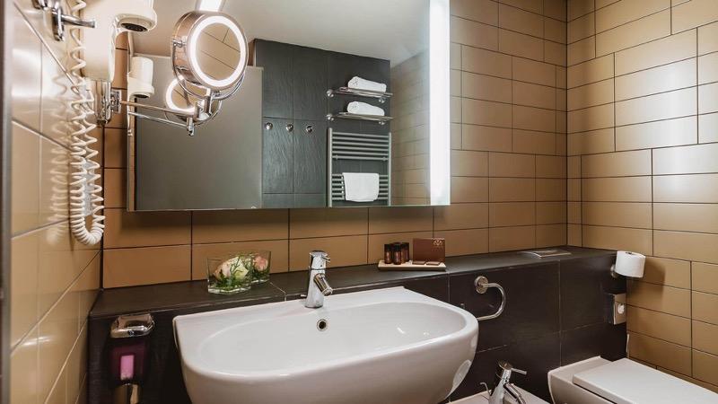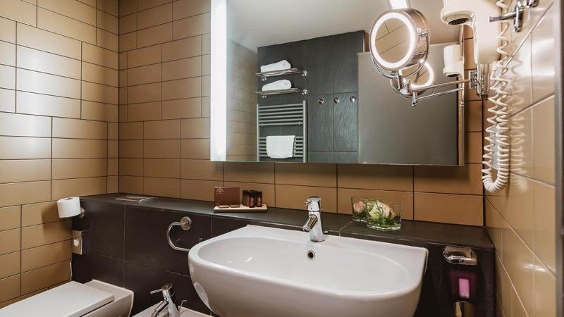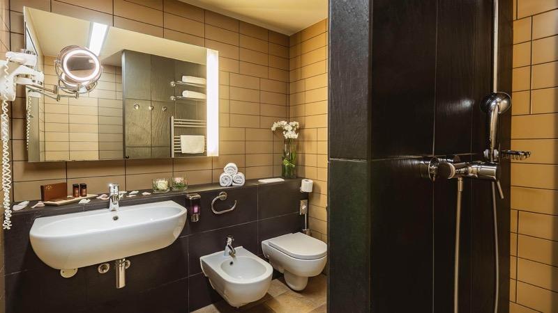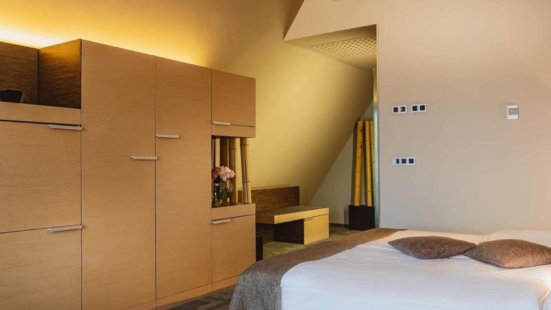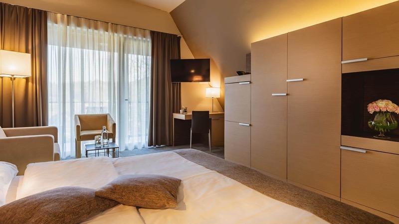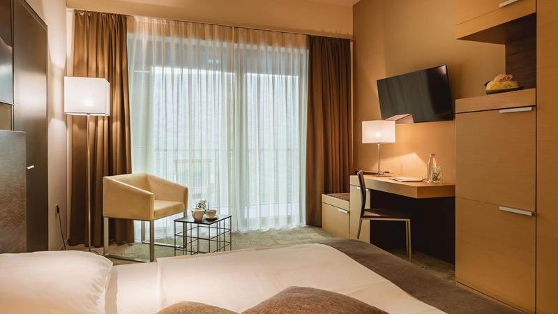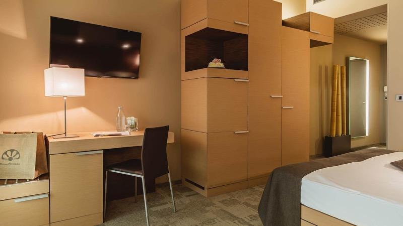 Ubytování v hotelu: Moderní dvoulůžkové pokoje s možností 1 přistýlky - vybavené koupelnou se sprchou a vanou, WC, SAT TV, radiem, telefonem, minibarem, sejfem, klimatizací, připojením na internet, internetem v TV, balkonem, pohled směr les nebo směr termální areál. K dispozici jsou župany a ručníky. Jsou zde i pokoje, které jsou propojeny spojovacími dveřmi a je možné je použít jako rodinné pokoje.